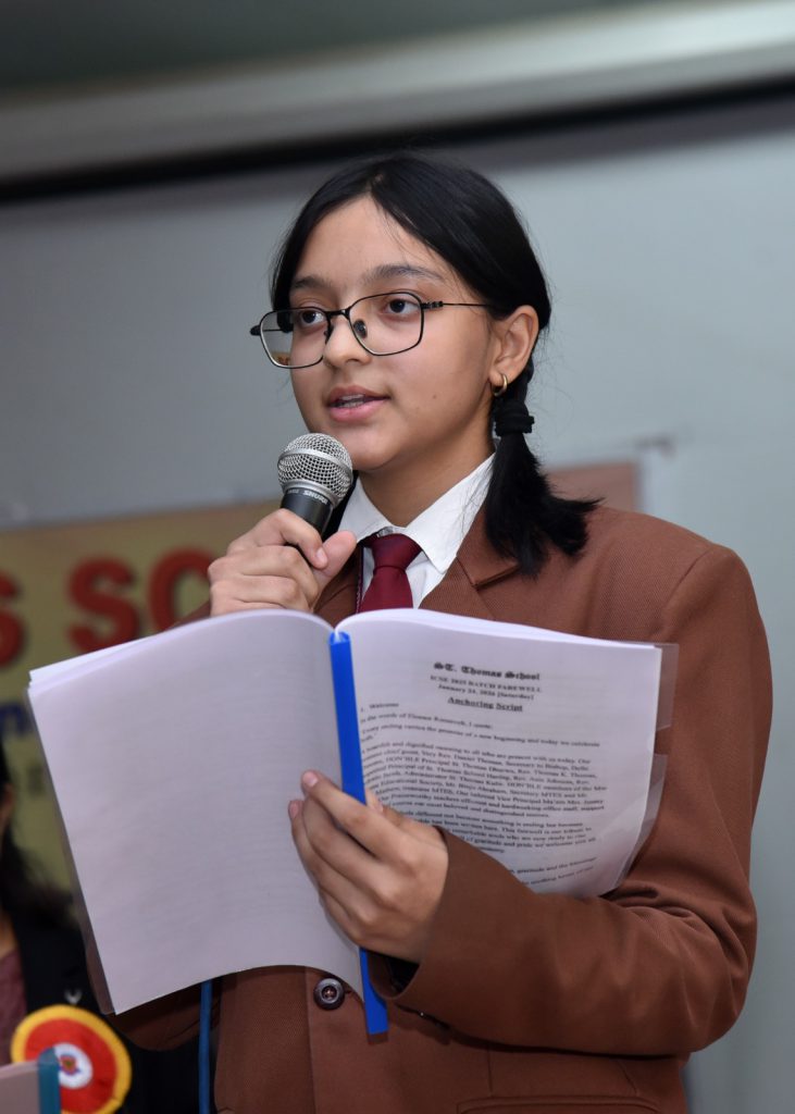 The Auditorium with Std X ,the Outgoing Batch of ICSE 2026,and the host Std IX ,teachers had a serene silence filled with reverence and solemnity.Some very prestigious awards that would create indefinite memories were given. Beginning with awards to the Head Boy Tejas Srivastava,Head Girl Roneya Chatterjee,IT Captains- Dhruvin Devraj(Boy), Aadya Akshara(Girl),the Choir n the band troupe.A new motivating award was introduced this year- The best academic performers award based on the result of Std X and the winners for the same were -First prize to Anishka Gupta (XG)