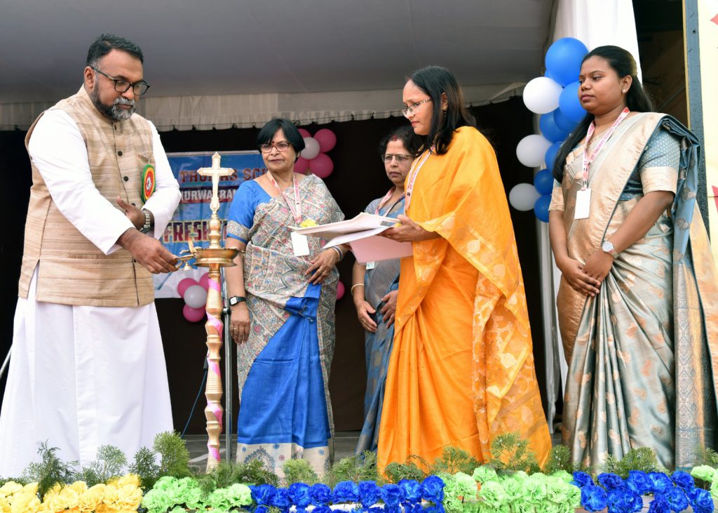 The programme began with a prayer song, followed by a welcome address by Master Shreyash Vasan of Std. II. The ceremonial lighting of the lamp by the Principal, Rev. Thomas K. Thomas, marked the inauguration. In his address, he encouraged students to grow with confidence and values.